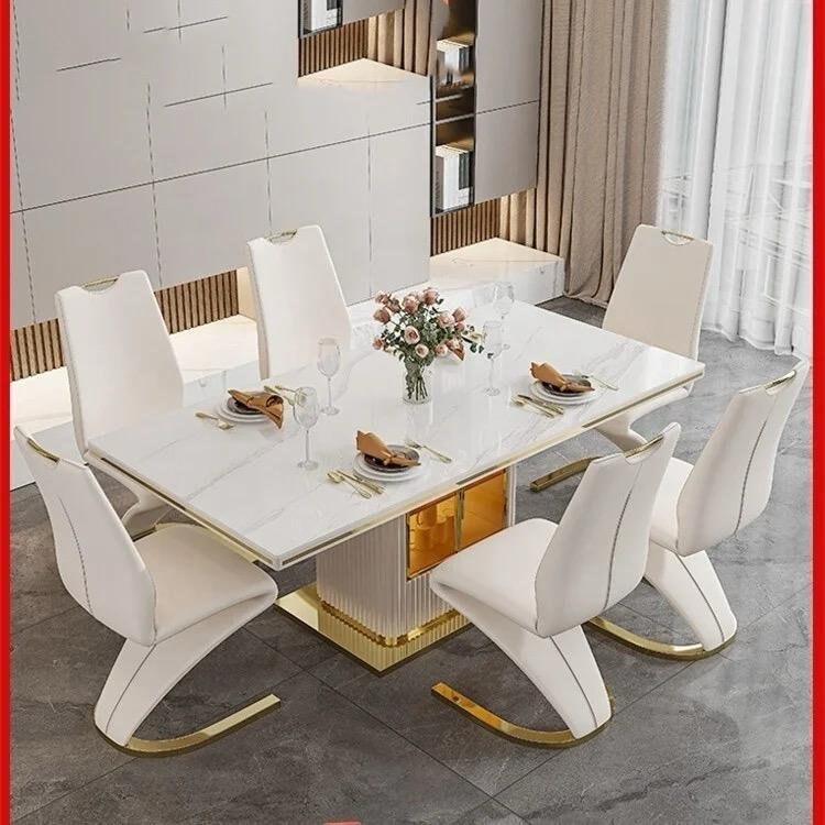 Ayva Marble Top Dining Table, Stainless Steel Base with Under Bar and Storage